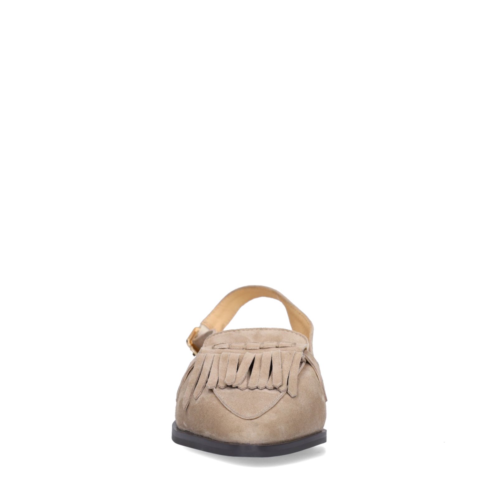 Taupe suède slingbacks met franjes van Manfield. De slingbacks hebben een blokhak van 4 cm, puntige neus en een gespsluiting rondom de enkel met franjes op de voorvoet. We adviseren als verzorging en bescherming de suède/nubuck spray in transparant.