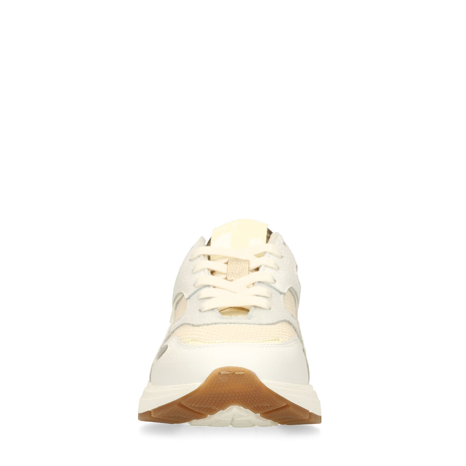 Witte leren sneakers van Manfield met een witte zool van 4 cm en crème synthetische details. We adviseren als verzorging en bescherming de Collonil Carbon Pro.