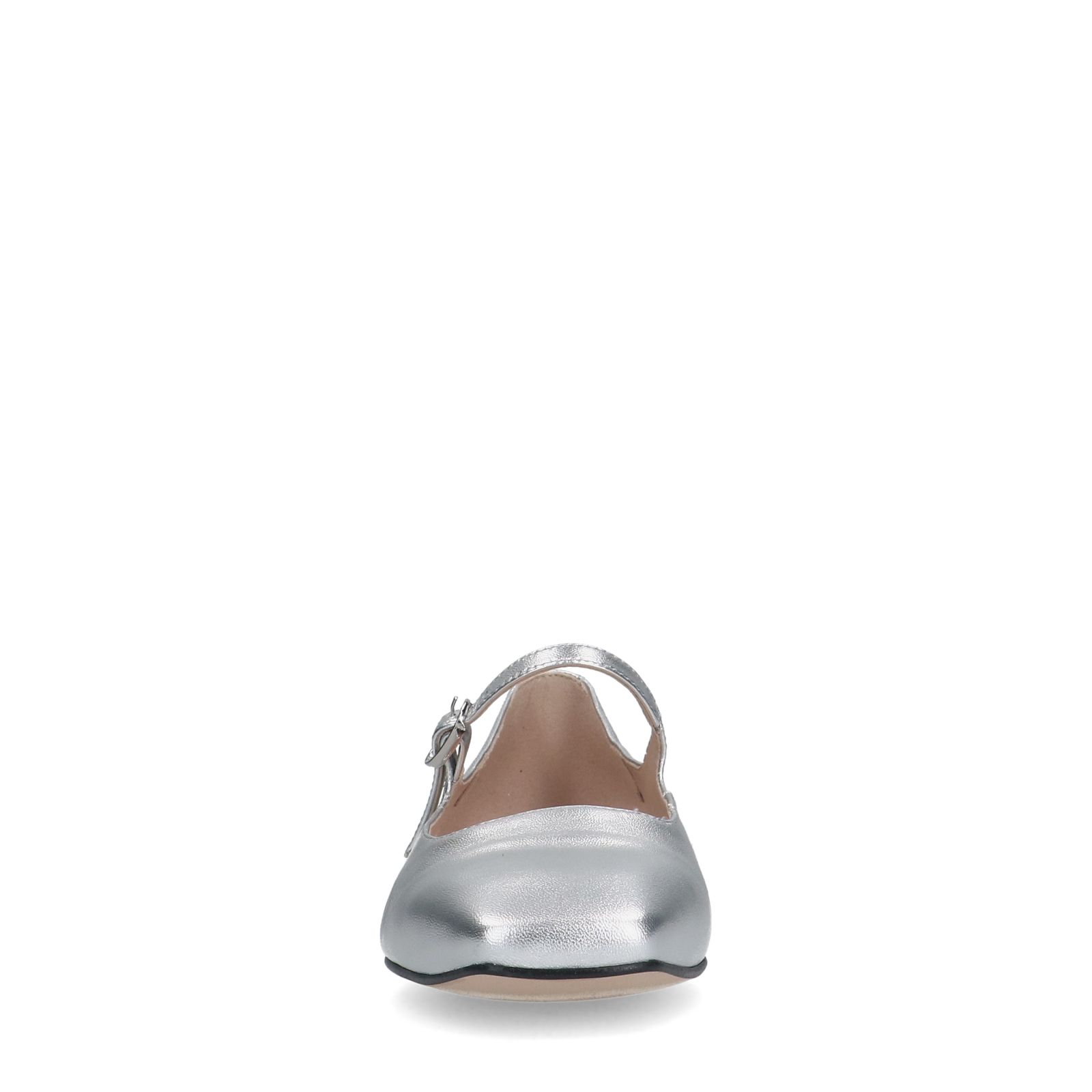 Zilveren leren ballerina's van Manfield met een gespsluiting en platte hak van 1 cm. We adviseren als verzorging en bescherming de Collonil Carbon Pro.