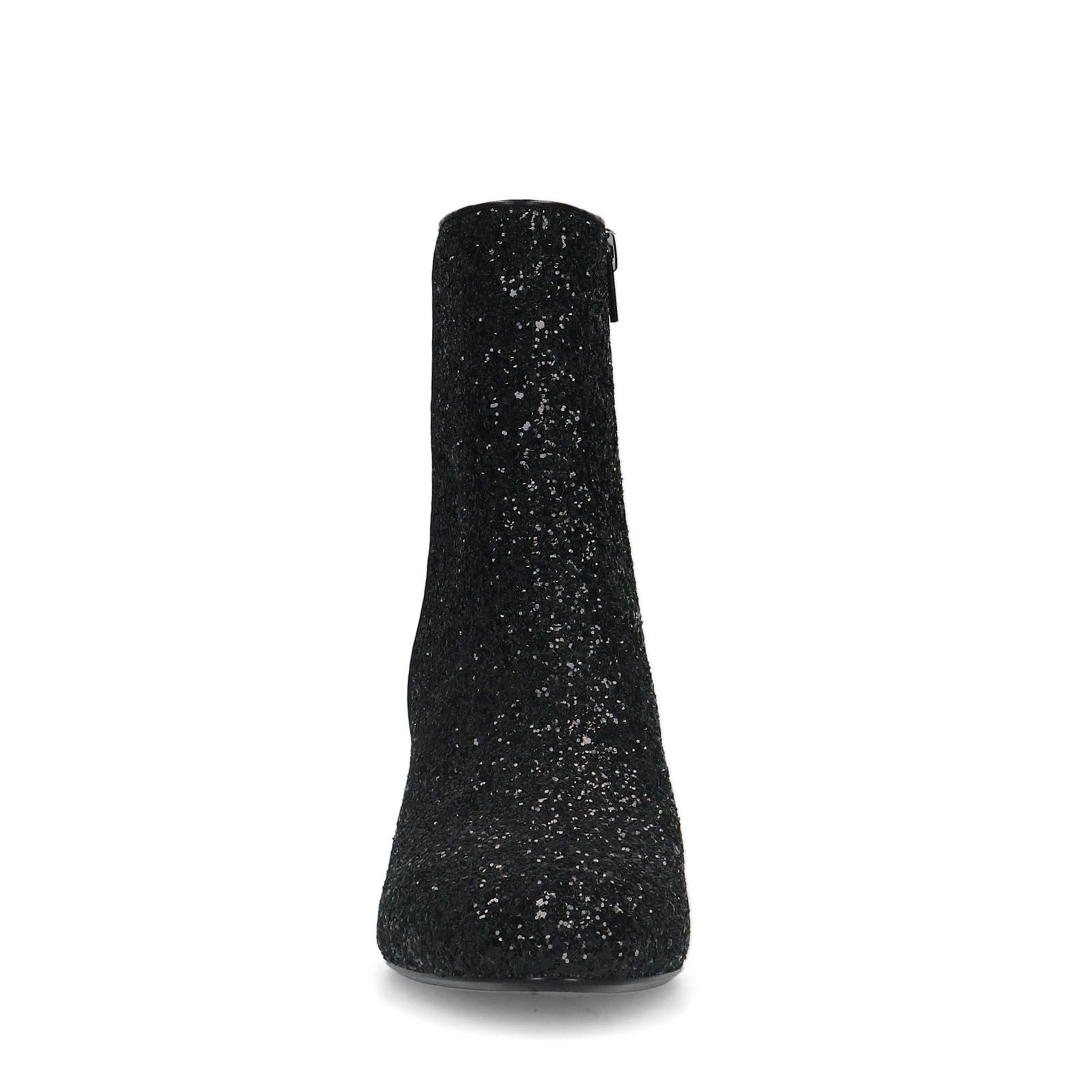 Zwarte glitter enkellaarsjes met hak van Manfield. Deze enkellaarsjes met hak zijn een échte eyecatcher welke ideaal te dragen zijn tijdens een feestje! Deze enkellaarsjes zijn voorzien van zilverkleurige glitters en hebben een blokhak met hoogte van 7 cm. Deze dames laarsjes kunnen gesloten worden door middel van een ritssluiting.