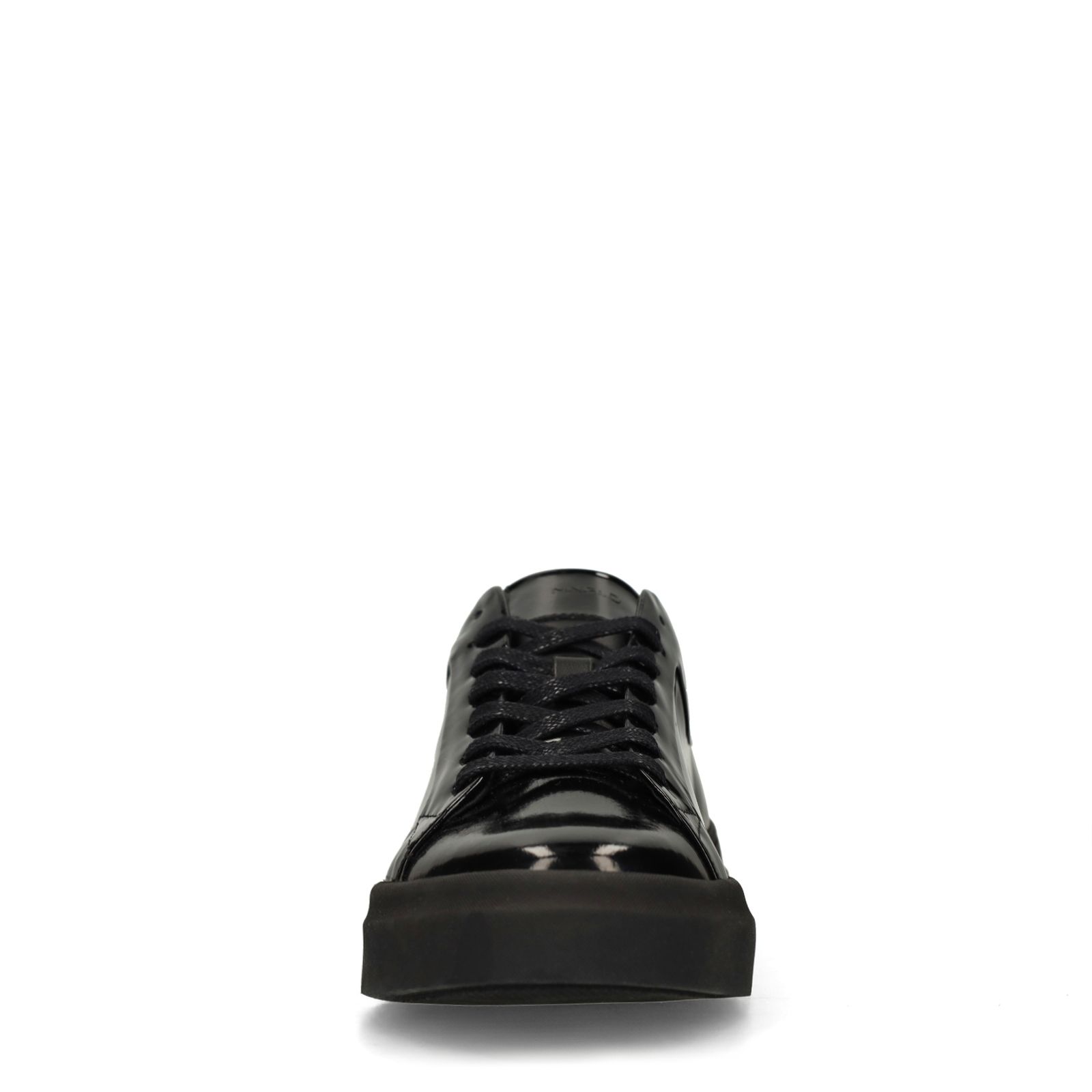 Zwarte lakleren sneakers van Manfield. De sneakers hebben een zwarte zool van 3 cm. We adviseren als bescherming en verzorging de Collonil Lack Mousse.