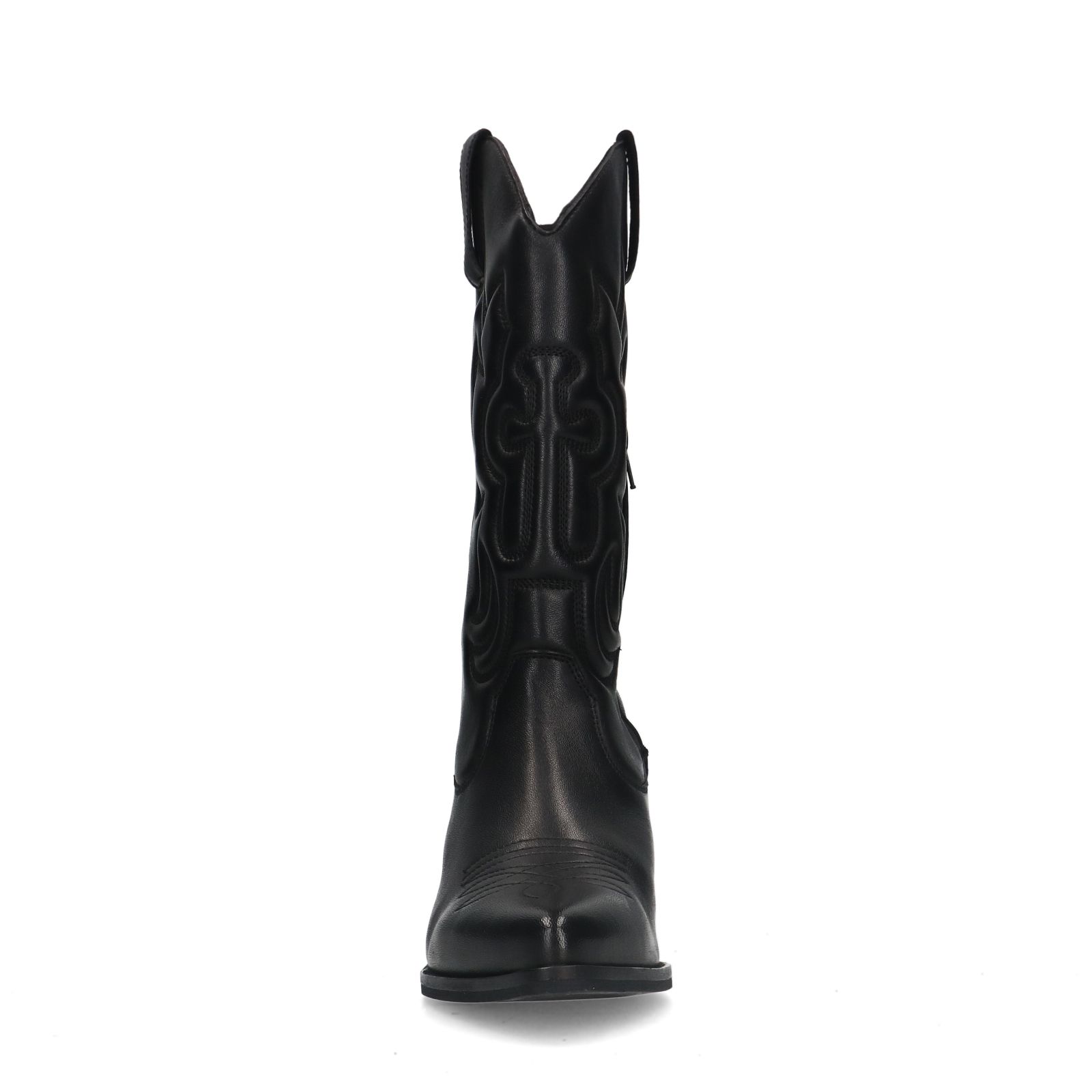 Zwarte leren cowboylaarzen van Manfield met schuinafgesneden blokhak van 5 cm en puntige neus. De laarzen hebben een schachthoogte van 27 cm en een schachtbreedte van 32 cm, gemeten bij een maat 37. We adviseren als verzorging en bescherming de Collonil Carbon Pro.