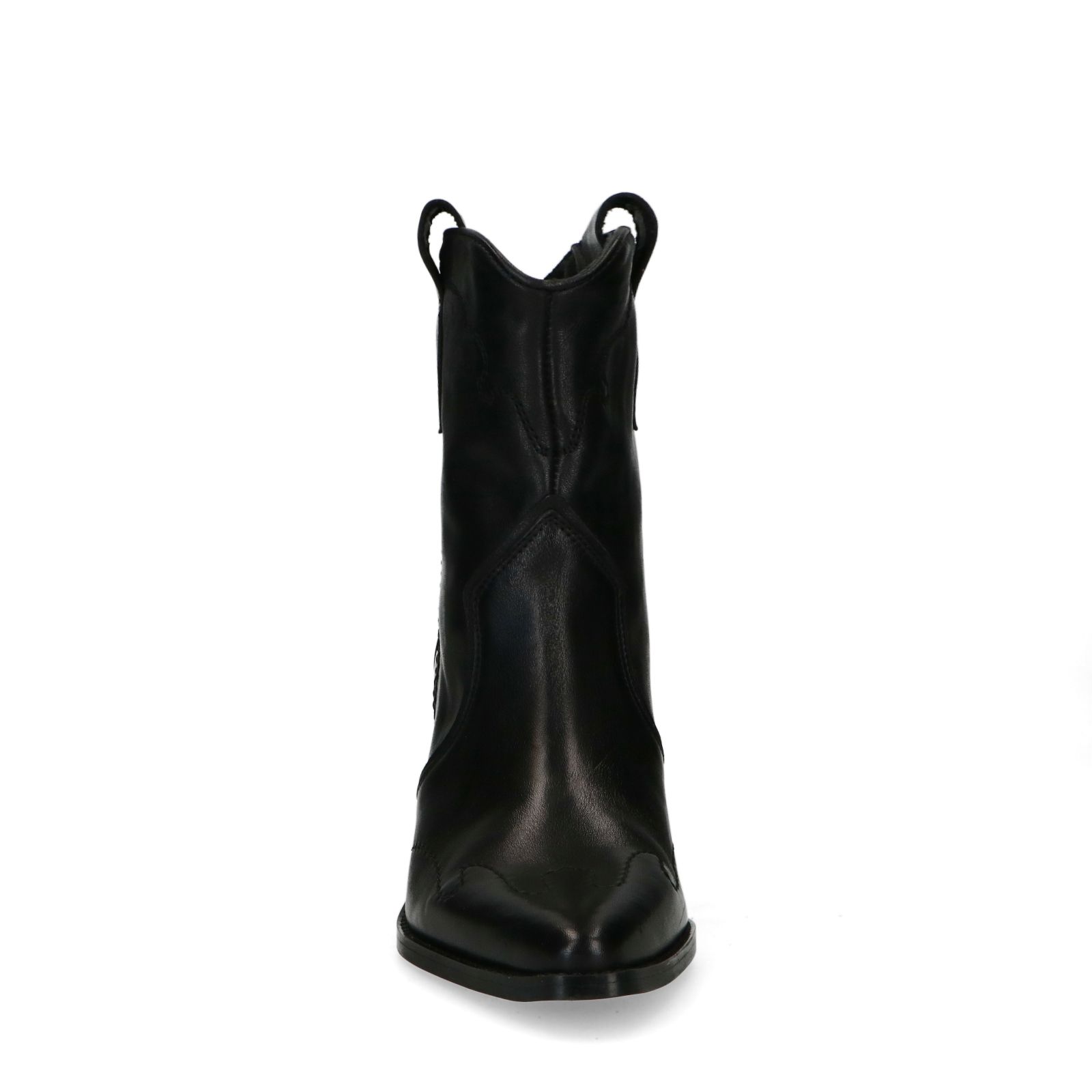 Zwarte leren cowboylaarzen van Manfield met blokhak van 7,5 cm, puntige neus en ritssluiting aan de binnenzijde. We adviseren als verzorging en bescherming de Collonil Carbon Pro.