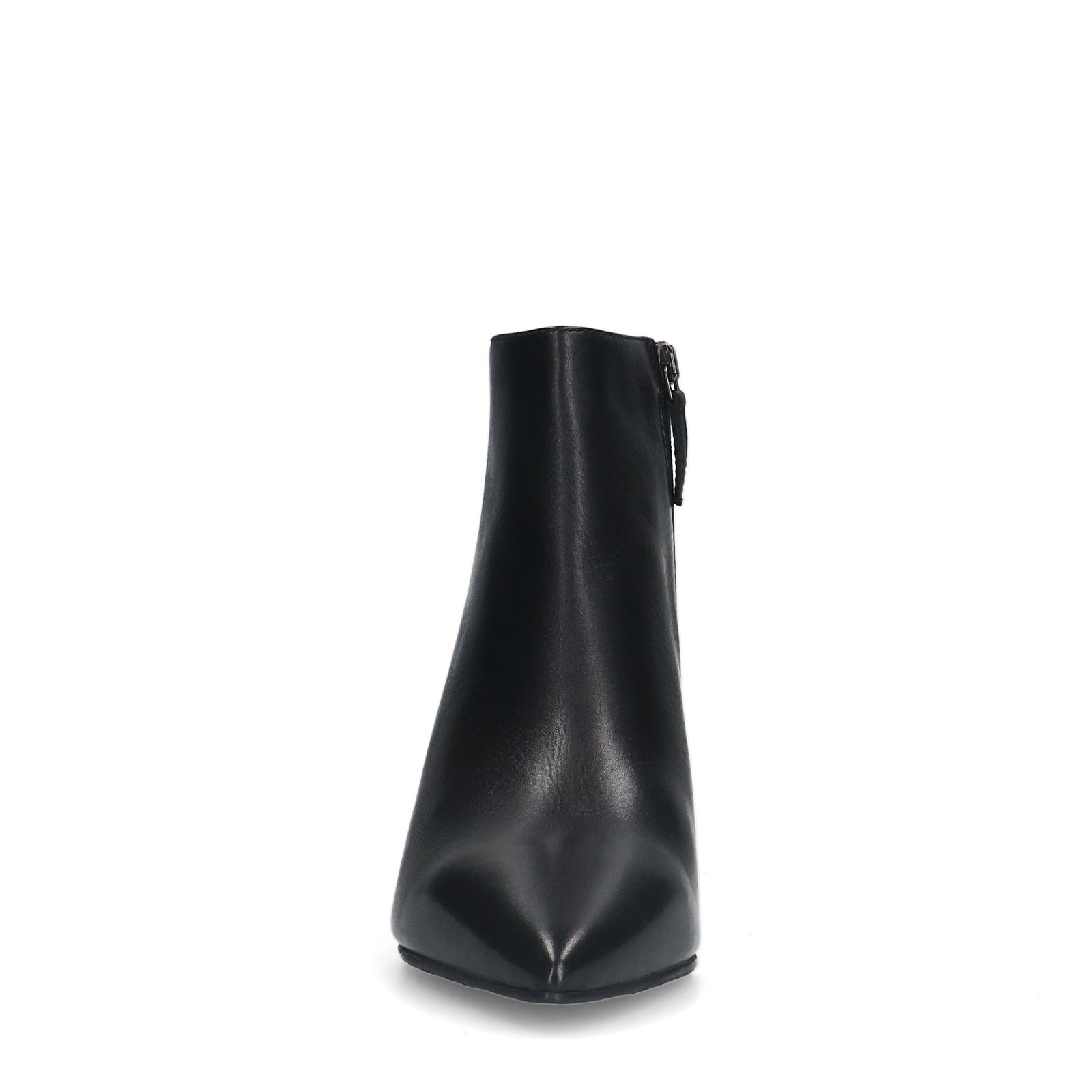 Zwarte leren enkellaarsjes met hak van Manfield. De laarsjes hebben een puntige neus, ritssluiting aan de binnenzijde en hak van 5 cm. We adviseren als verzorging en bescherming de Collonil Carbon Pro.