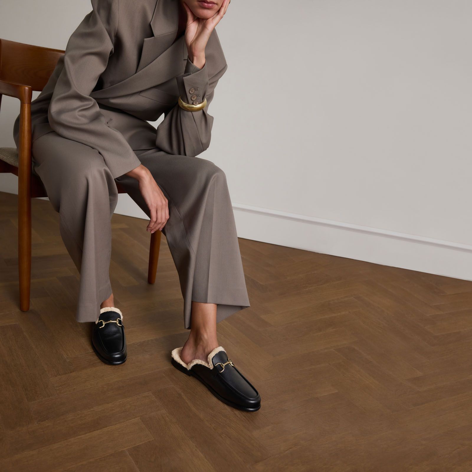 Zwarte leren instappers met gouden chain