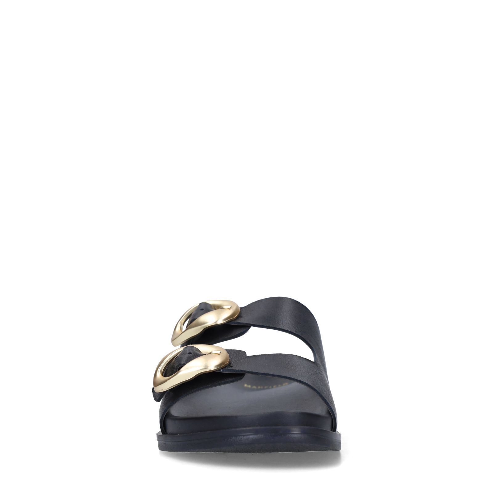 Zwarte leren sandalen met gesp van Manfield. De sandalen hebben een plateauzool van 3 cm en twee brede banden met een gesp die over de voorvoet lopen. We adviseren als verzorging en bescherming de Collonil Carbon Pro.