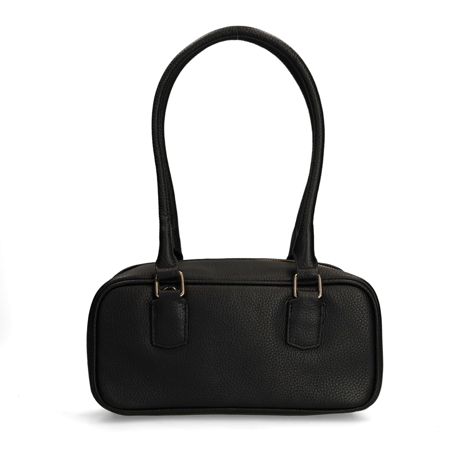 Zwarte leren schoudertas van Manfield met gouden details. De tas heeft een ritssluiting en in de binnenkant twee zijvakjes. De afmetingen van de tas zijn 29x14x10 cm (BxHxD), met een verstelbare band van 120 cm.