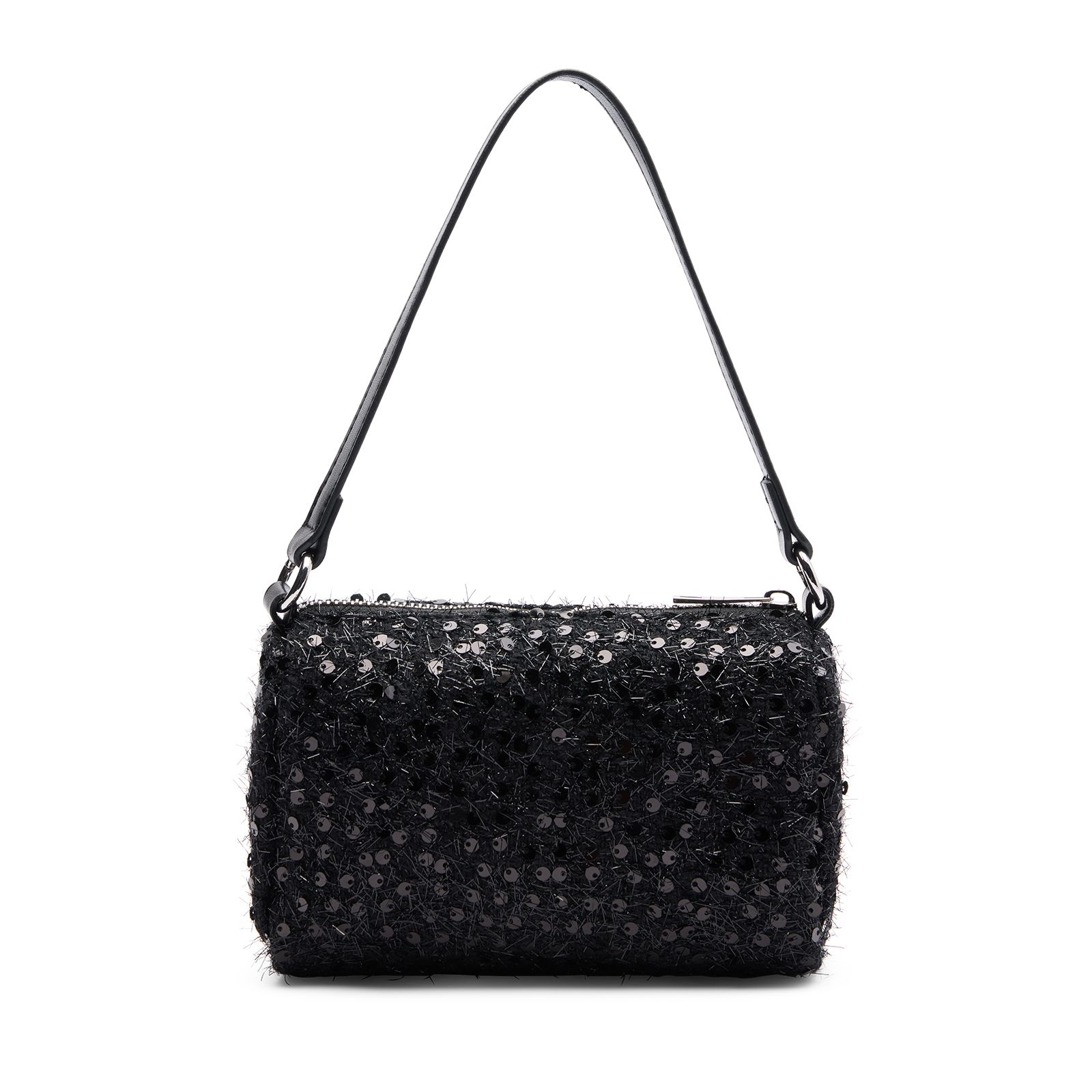 Zwarte pailletten schoudertas van Manfield met ritssluiting. De afmetingen van de tas zijn 18x13x6 cm (BxHxD).