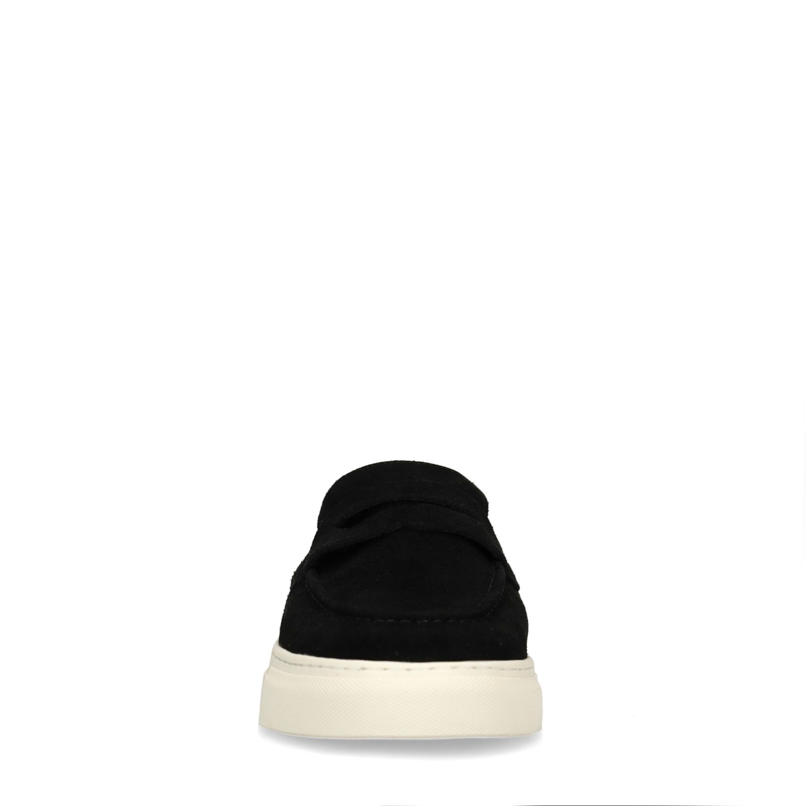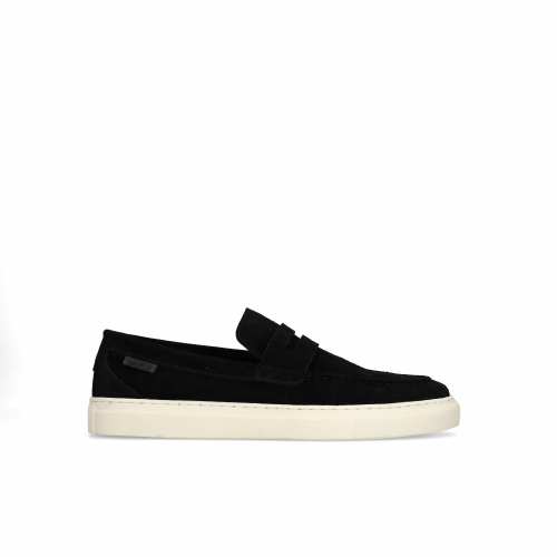 Zwarte suède loafers van Manfield met zwarte stiksel die over de voorvoet lopen en een witte zool van 3 cm. We adviseren als verzorging en bescherming de suède/nubuck spray in zwart.